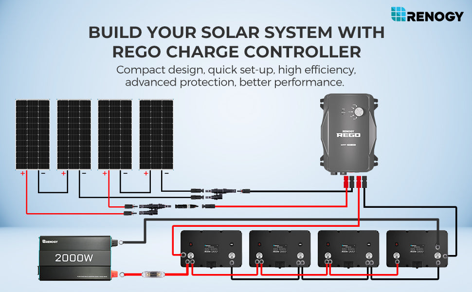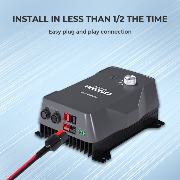 The REGO charge controller features a custom-designed Anderson to MC4 adapter cable, offering a quick and easy way to connect the controller to your solar panels—reducing installation time by 60%! Its compact and durable design blends advanced technology with style, while its minimized size saves installation space compared to other controllers. Please note: If you wish to connect the charge controller to a non-REGO house battery, an Anderson to Ring terminal cable (sold separately in the Renogy Store) will be required.