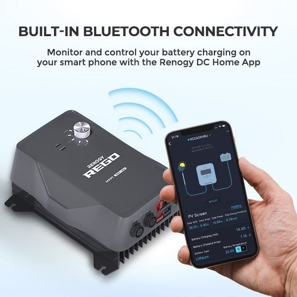 The built-in Bluetooth allows you to monitor the REGO charge controller on your smartphone with the Renogy DC Home App. With the app, you can customize multiple battery data such as the boost voltage, float voltage, and duration data.