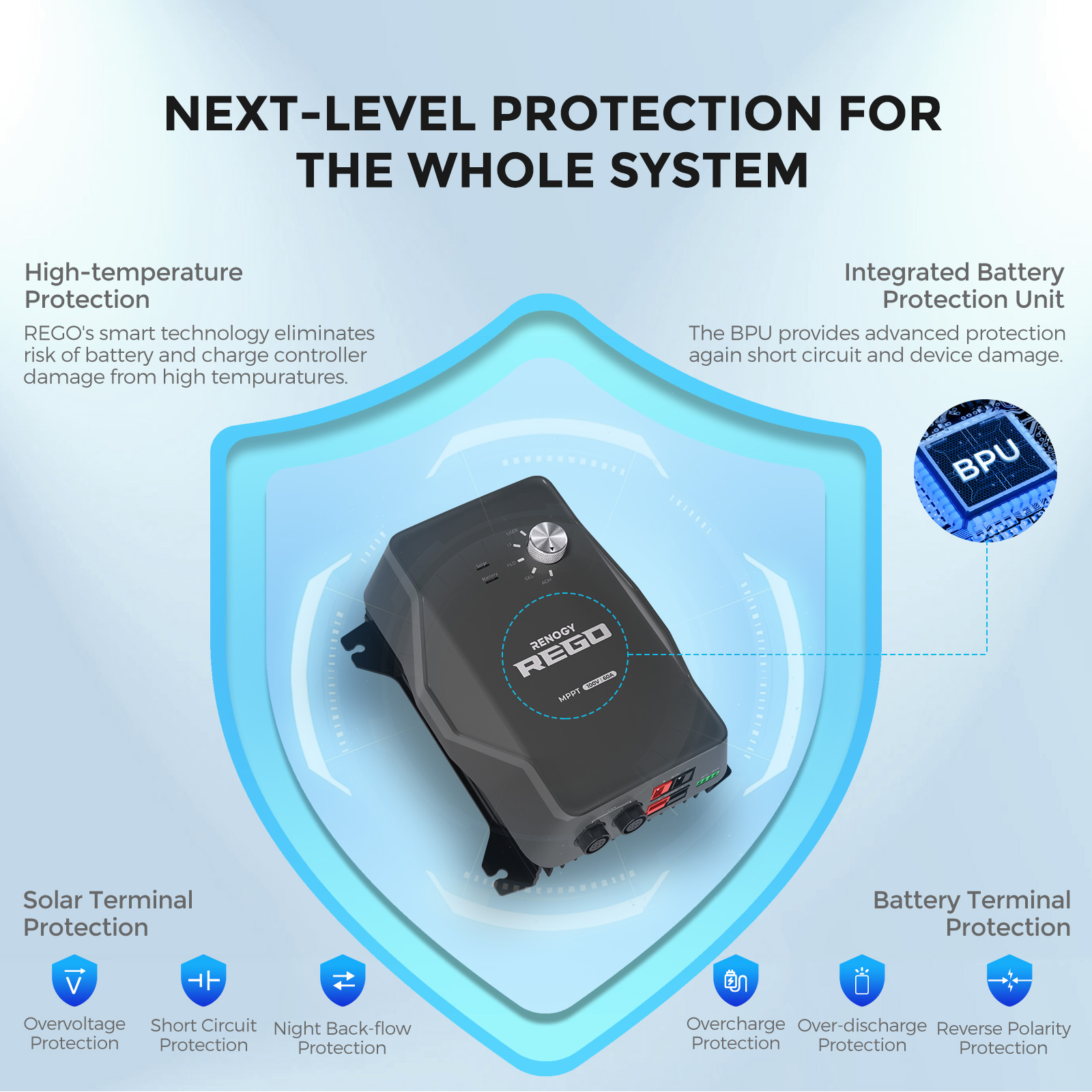 The REGO charge controller features a three- to four-stage charging design (Bulk, Boost, Float, EQU) for lead-acid batteries and a two-stage design for lithium batteries, ensuring high charging efficiency while optimizing battery health for a longer lifespan. It offers comprehensive protection on both solar input and battery output terminals. The integrated High Battery Protect Unit (BPU) disconnects non-essential loads from the battery before it is fully discharged or when it lacks sufficient power to start the engine, providing complete system protection.