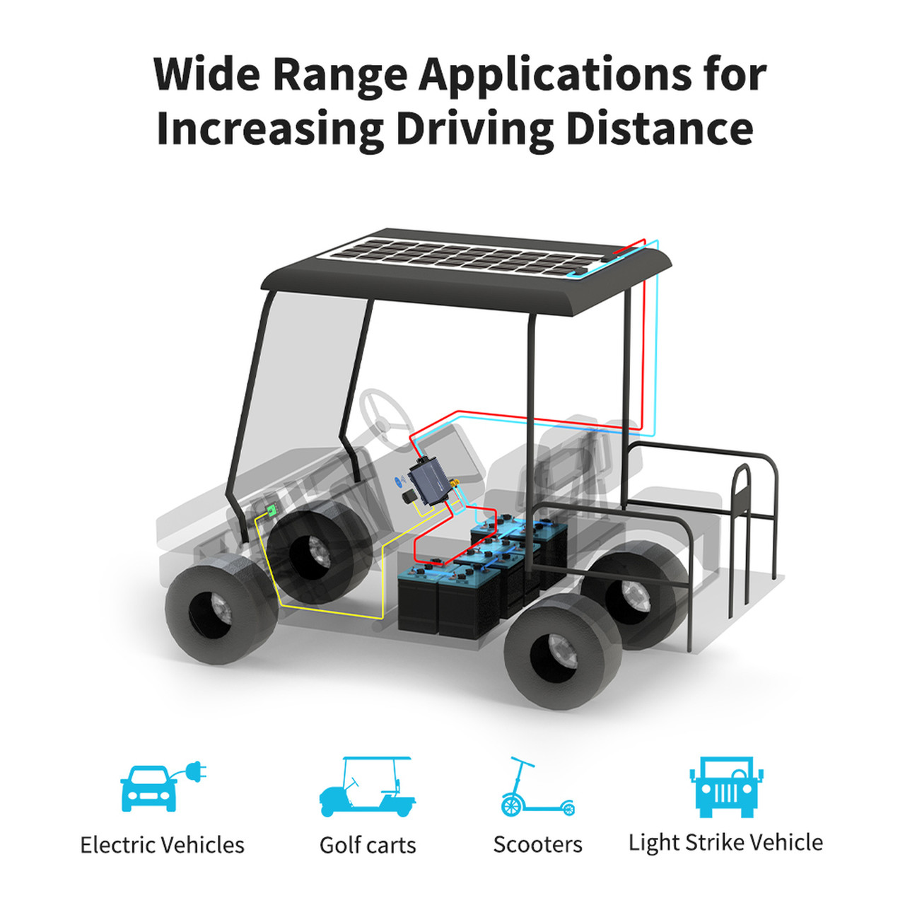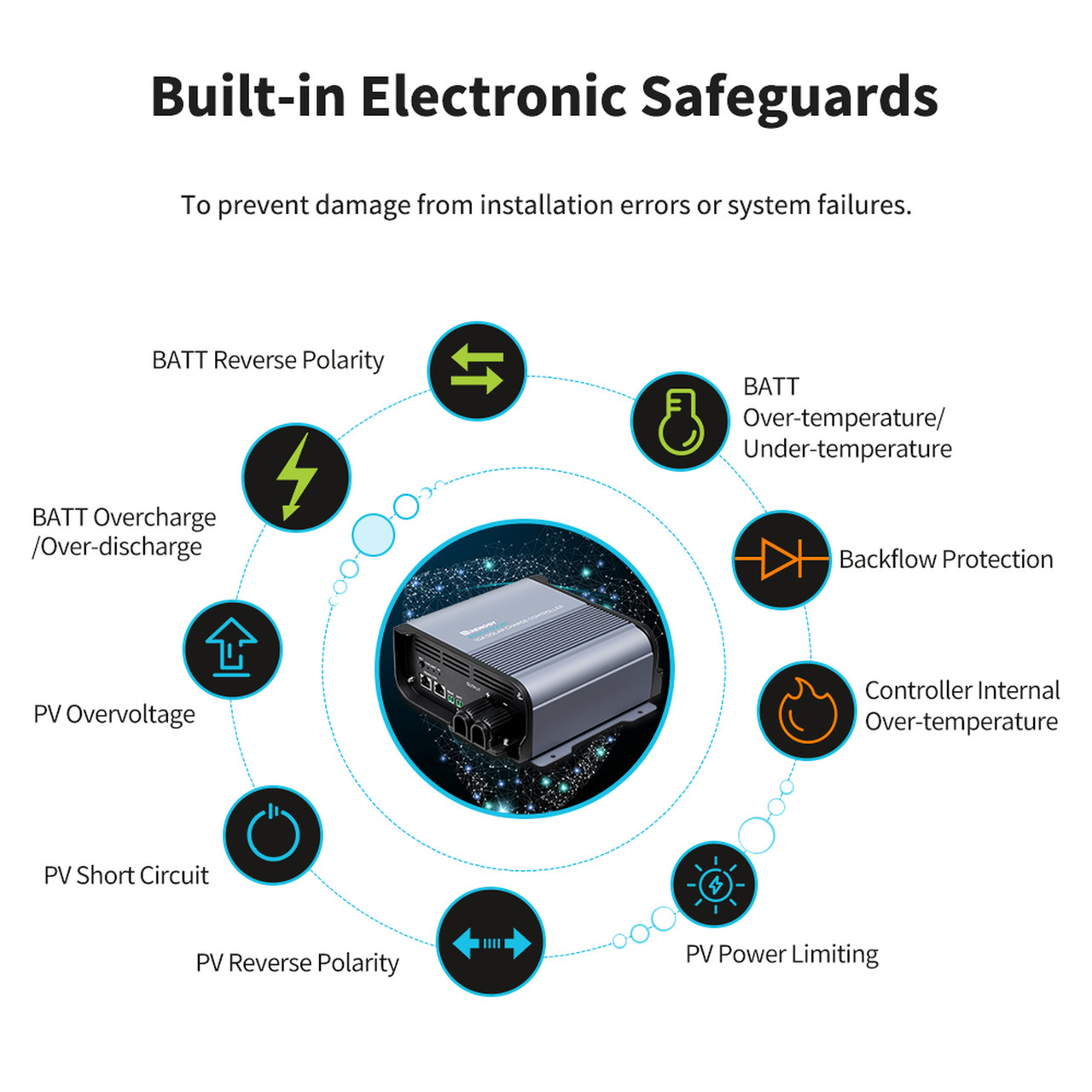 Advanced MPPT Technology with minimum 99% tracking efficiency and 90% charge conversion efficiency for 4-stage battery charging (Bulk, Boost, Float, and Equalization) with charging.